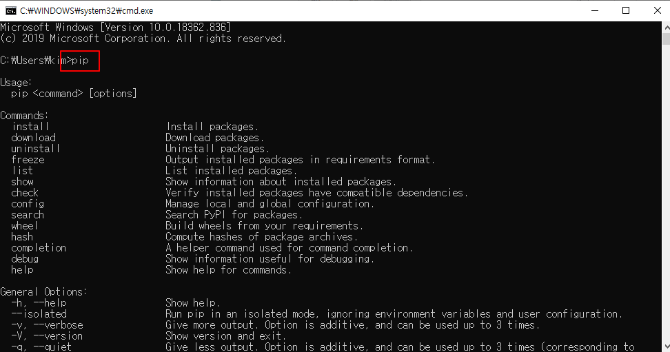 이 명령프롬프트에 pip라고 쳤을 때 다음과 같이 나온다면 설치 성공입니다.
