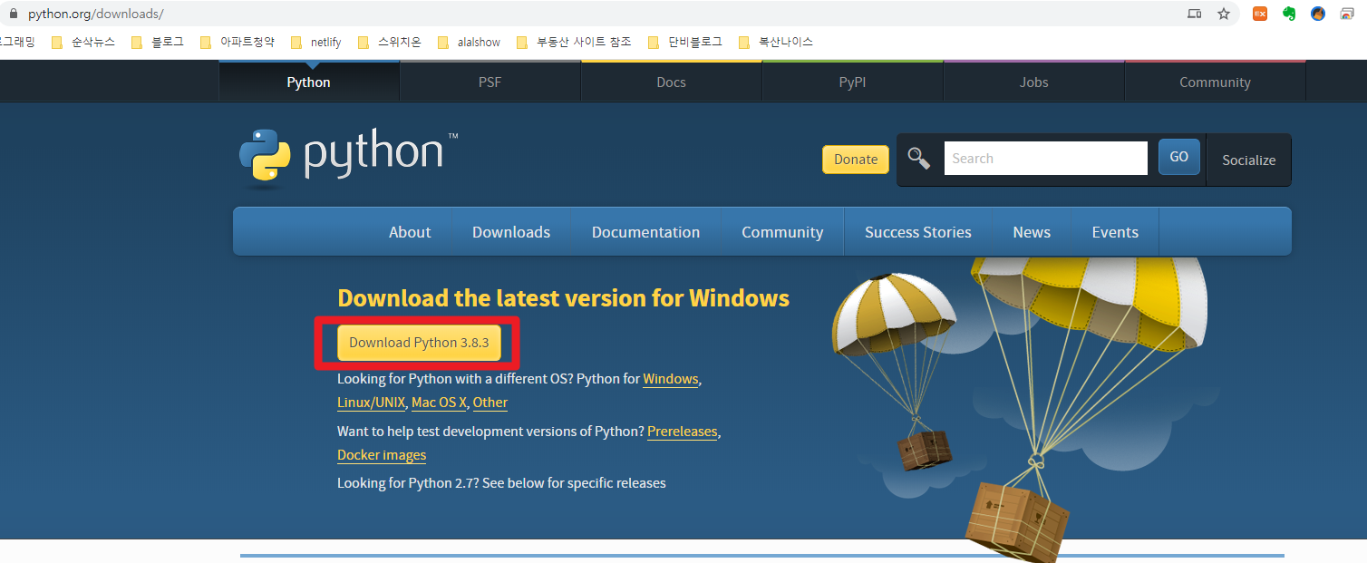 가장 먼저 파이썬 사이트에가서 파이썬 프로그램을 다운받습니다.