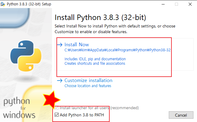 주의하셔야할 것은 아래에 Add Python 3.8 to PATH를 클릭 하셔야 하는 것이다. 개발자가 아니시라면 환경 변수니 PATH니 하는 개념을 잘 모르실 수도 있지만 잘 모르면 일단 체크하시면 됩니다.