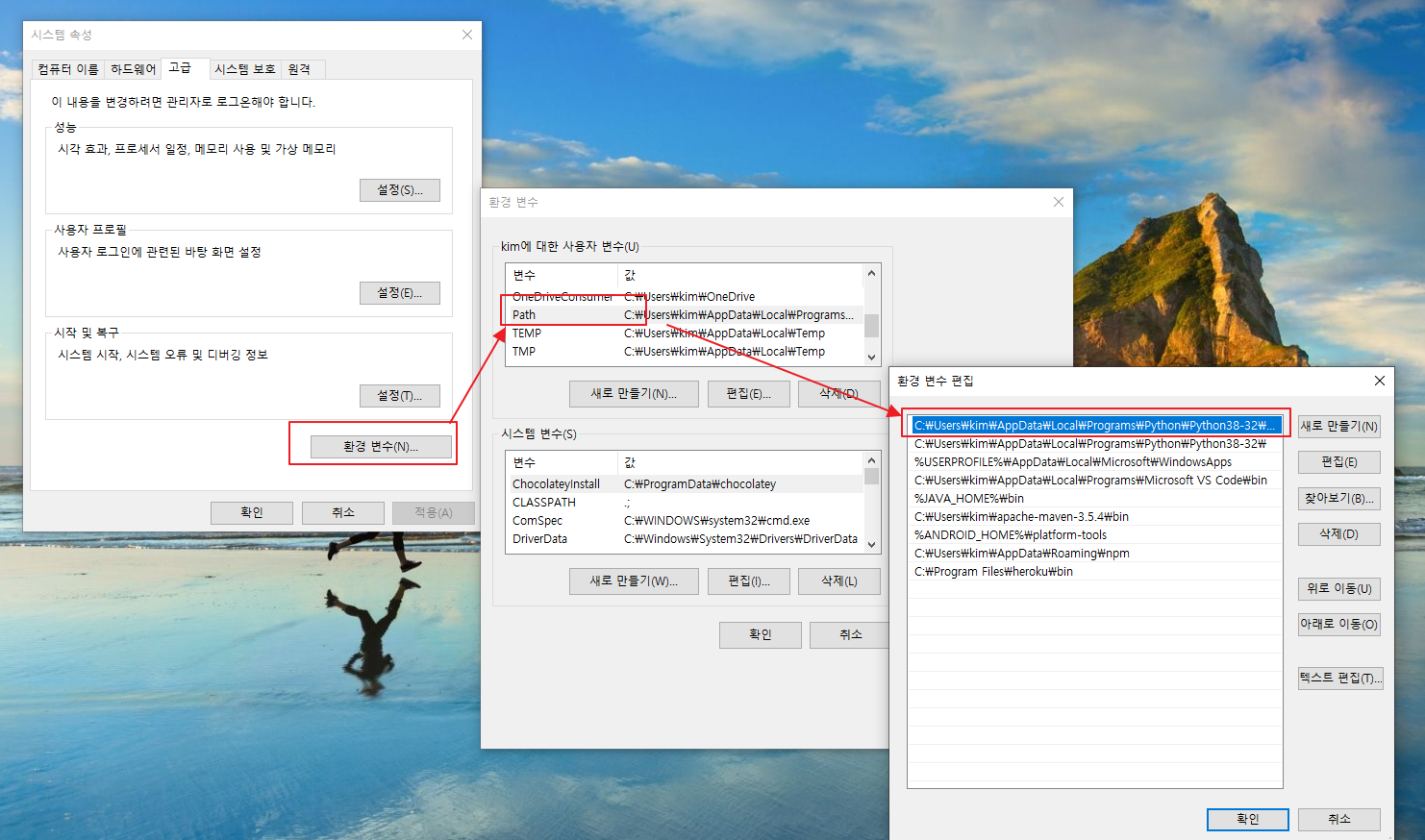 이게 뭔지 간단하게만 설명드리면 "파이썬의 경로는 여기입니다" 라고 컴퓨터에게 알려준다고 보면 됩니다. 이걸 컴퓨터에게 알려주면 이제 컴퓨터의 어느 경로에서든 파이썬을 실행하면 내가 path로 잡아둔 이 파이썬 프로그램이 실행됩니다.