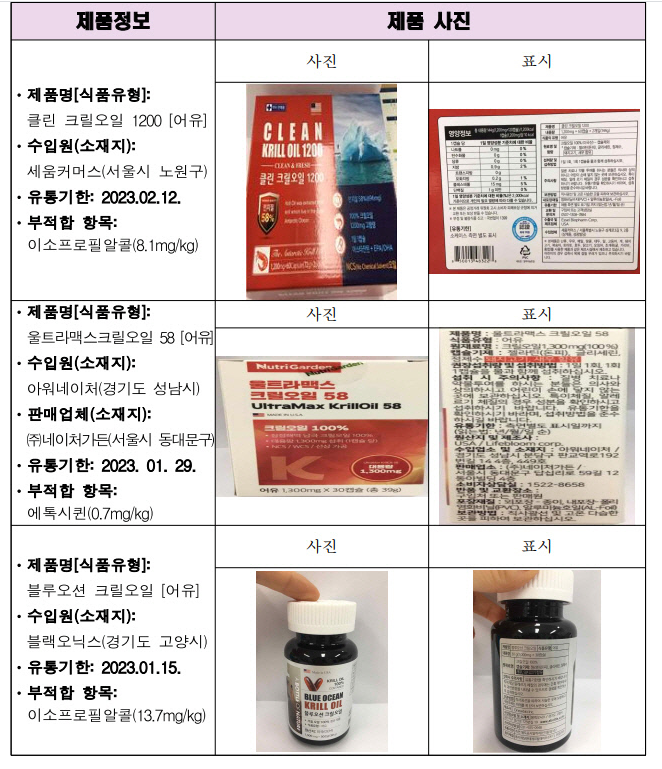 초산에틸과 이소프로필알콜은 기름을 짜내는 용매로도 써 서는 안 되는 성분입니다. 이소프로필알콜은 ‘클린 크릴오일 1200(수입원 세움 커머스)’와 ‘블루오션 크릴오일(수입원 블랙오닉스)’에서 검출됐다. ‘크릴오일(수입원 에이치엘티)’ ‘뉴브리아 크릴오일(수입원 유케이헬스케어)’ ‘프리미엄 크릴오일(수입원 비헬스코리아)’에선 초산에틸이 나왔다고 합니다.