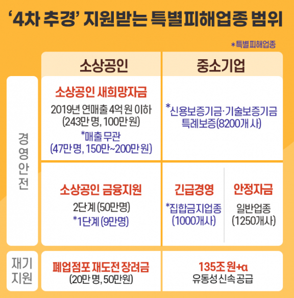 | 집합금지업종(전국 소상공인) | 뷔페, PC방, 콜라텍, 노래연습장, 실내 공연장, 실내 집단운동, 방문판매, 유통물류센터, 대형 학원(300인 이상) | 200만원 |