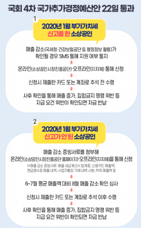 우선 정부에서 올해 1월 부가가치세를 신고한 소상공인을 대상으로문자메시지로 '신청대상자'임을 통보할 예정이라고 합니다.