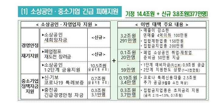 | 집합금지업종(전국 소상공인) | 뷔페, PC방, 콜라텍, 노래연습장, 실내 공연장, 실내 집단운동, 방문판매, 유통물류센터, 대형 학원(300인 이상) | 200만원 |