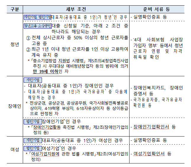 취약계층 (장애인 등) 및 육성대상(청년 등) 중 1금융권 대출이 어려운 저신용자(신용 7등급 이하)를 중점 지원함으로써 경영 안정화 도모