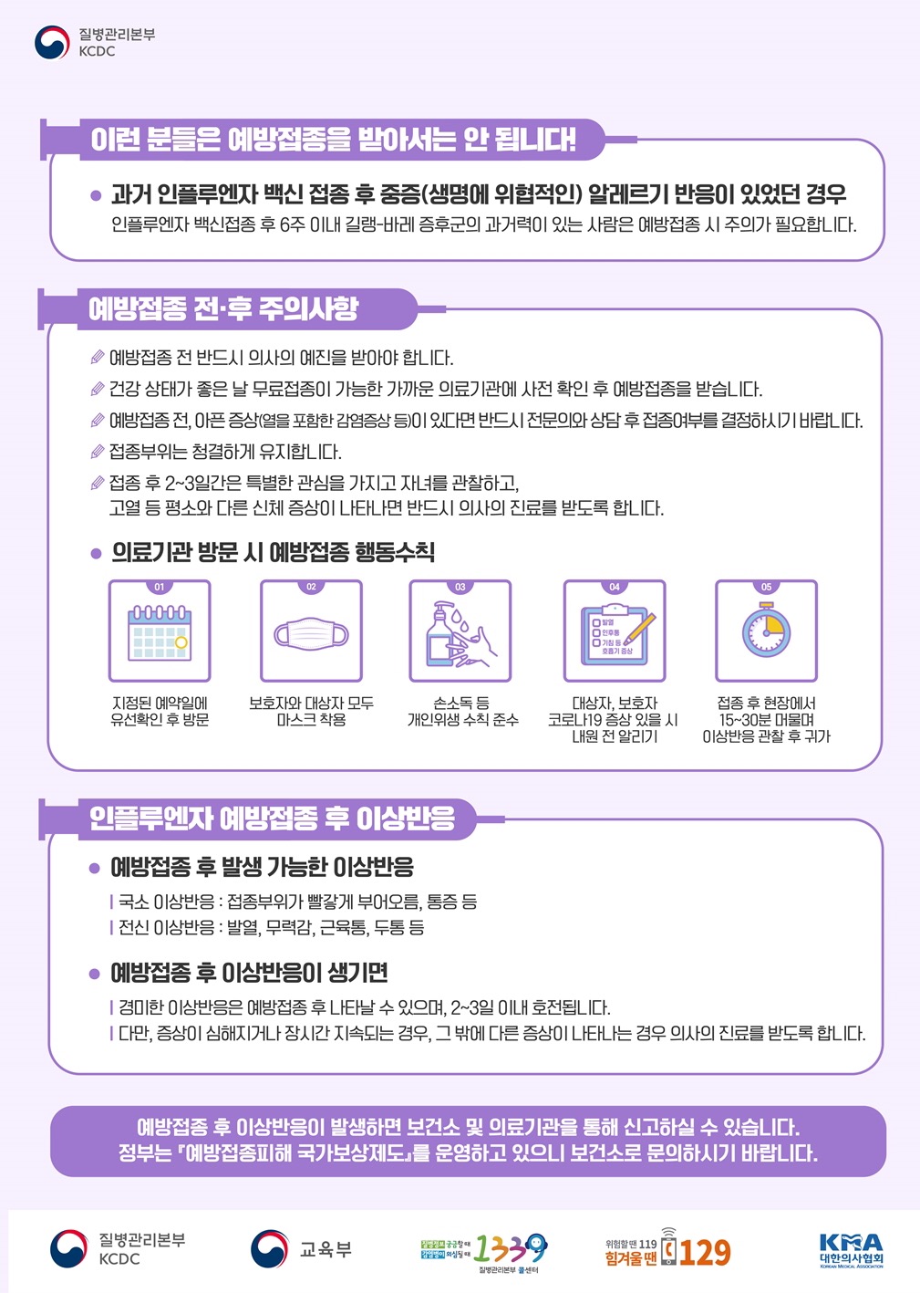 국가에서는 '인플루엔자 국가예방접종 지원사업'을 시행하여 무료로 예방접종을 받을 수 있도록 하고 있습니다.