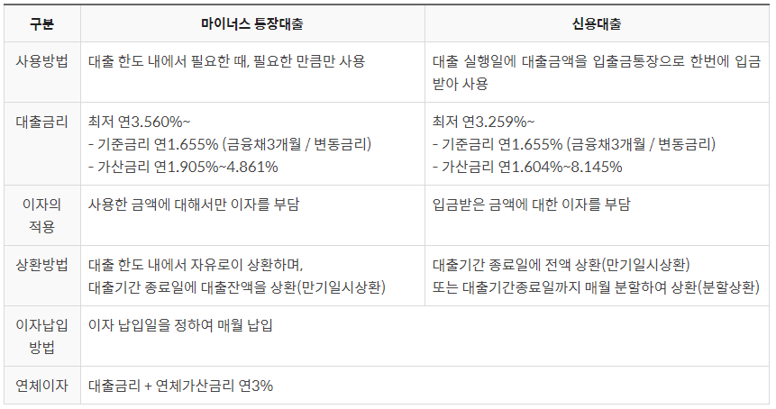 - 마이너스 통장대출은 받는 그 자체로 대출로 인정되기 때문에 돈을 얼마나 쓰느냐에 상관 없이 한도 만큼 대출 한 것으로 인정된다. (신용등급 관리에 불리할 수 있음)