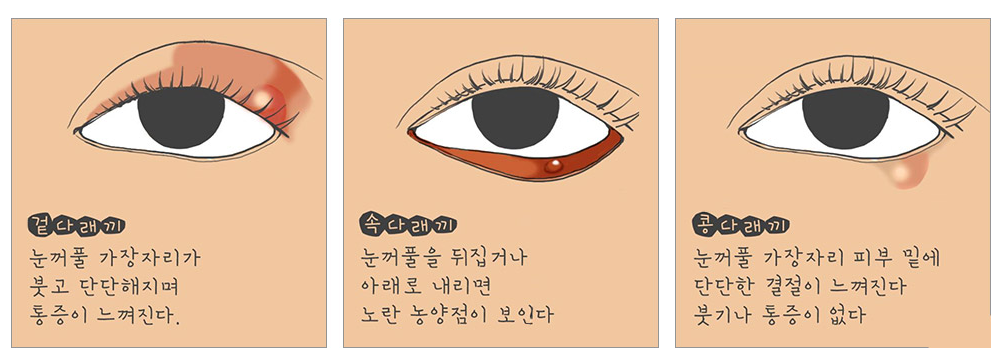 - 겉다래끼는 눈꺼풀의 가장자리가 부으면서 통증이 생기고 해당 부위가 단단해져(경결) 압통이 심해집니다.