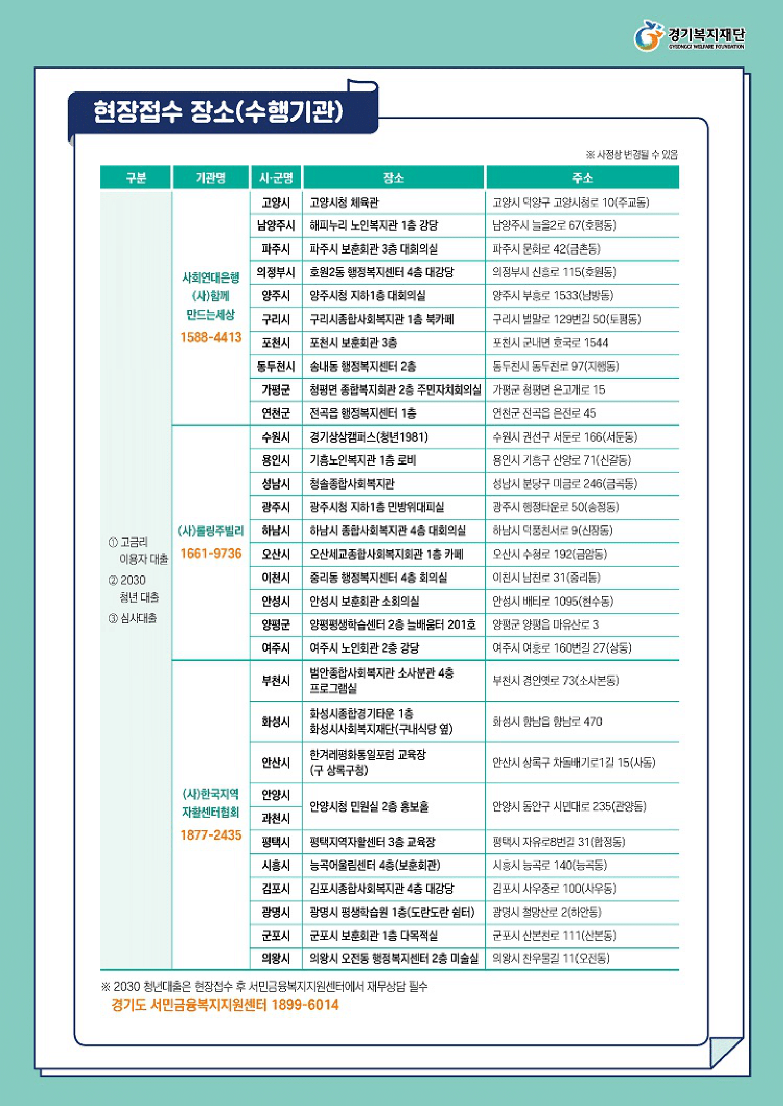 - 온라인신청 : 경기복지플랫폼 (ggs-loan.ggwf.or.kr)