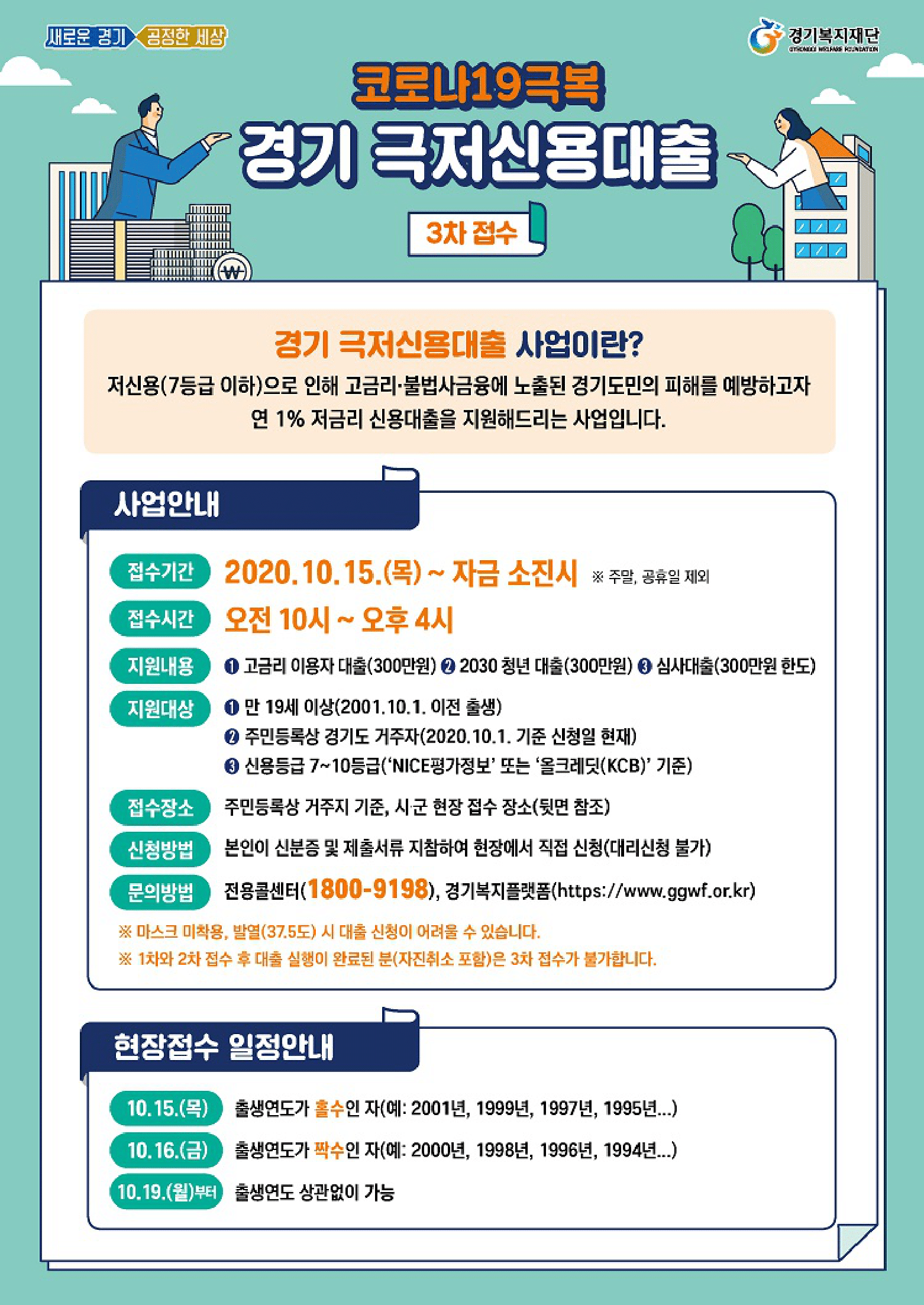 경기도는 신종 코로나바이러스 감염증(코로나19) 사태로 어려움을 겪는 저신용자에게 소액 대출로 긴급 생계자금을 지원하는 '극저 신용대출' 3차 신청을 오는 10월 15일부터 접수한다고 밝혔습니다.
