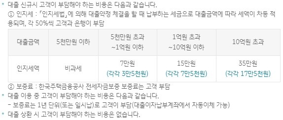 - 주택도시보증공사 전세금안심대출보증서 : 대출금액의 0.05% + 전세금반환보증금액의 0.128%(아파트), 0.154%(그 외 주택)