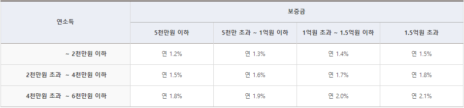 - 한국주택금융공사 주택금융신용보증서 : 0.12%(임차보증금 1억원 이하), 0.15%~0.22%(임차보증금 1억원 초과 ~ 4억원 이하)