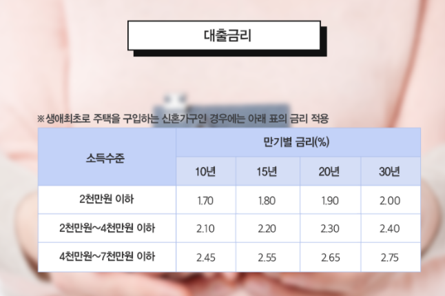 대출 기간은 10년, 20년, 30년입니다. 소득과 대출기간에 따른 대출금리는 다음과 같습니다.