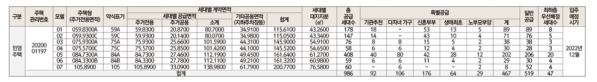 | 공급규모 | 지하2층, 지상17층, 14개동 총 986세대 및 부대복리시설(※근린생활시설은 별도 공급예정) 일반공급 519세대,특별공급 467세대 (일반[기관추천] 특별공급 92세대, 다자녀가구 특별공급 106세대, 신혼부부 특별공급 176세대, 생애최초 특별공급 64세대, 노부모 부양 특별공급 29세대) |
