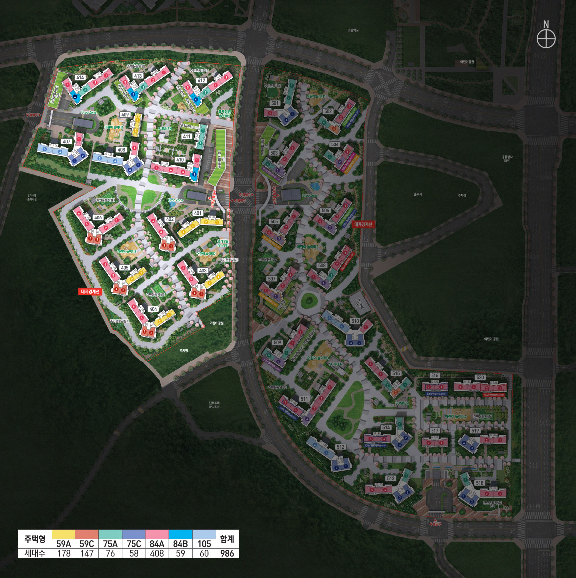 | 공급규모 | 지하2층, 지상17층, 14개동 총 986세대 및 부대복리시설(※근린생활시설은 별도 공급예정) 일반공급 519세대,특별공급 467세대 (일반[기관추천] 특별공급 92세대, 다자녀가구 특별공급 106세대, 신혼부부 특별공급 176세대, 생애최초 특별공급 64세대, 노부모 부양 특별공급 29세대) |