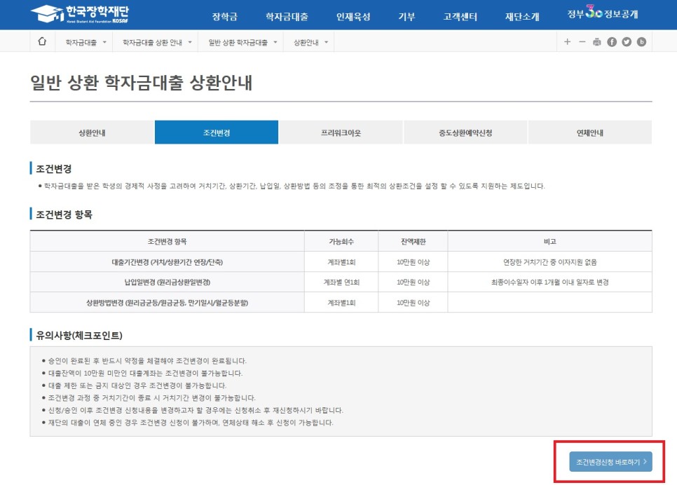 조건변경 제도는 일반학자금 대출실행 시 약정한 대출조건을 변경하는 제도로, 고객의 재무상황을 고려한 맞춤형 상환서비스입니다.