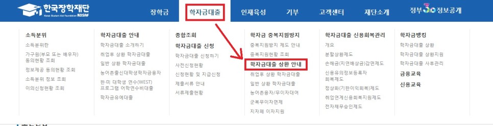 1.한국장학재단 홈페이지에서 [학자금대출] → [학자금대출상환안내]를 클릭해주세요!