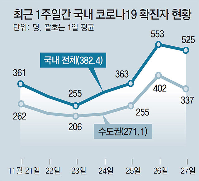 현재 11월 21일부터 300명을 넘어서더니, 26일에 이르러서는 500명이 넘는 대유행의 징조가 보이고 있습니다. 이 상태로 가다가는 수도권 뿐만 아니라 전국적으로 확진자가 더욱 늘어날 것이라는게 전문가들의 공통된 의견입니다.
