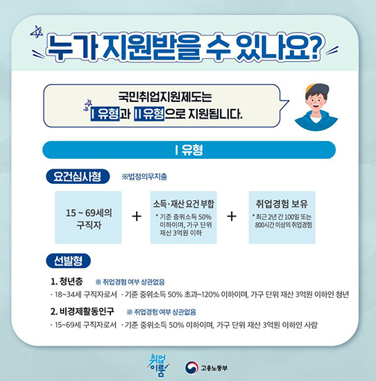 [15~69세의 구직자] + [소득·재산 요건 부합 (기준 중위소득 50% 이하이며, 가구 단위 재산 3억원 이하)] + [취업경험 보유 (최근 2년 간 100일 또는 800시간 이상의 취업경험)]