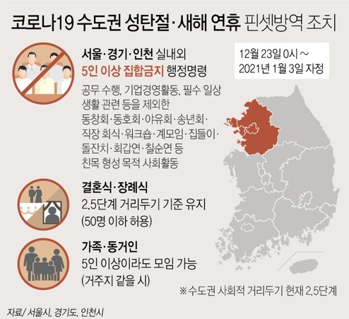 수도권 지방자치단체가 연합하여 서울특별시, 인천광역시, 경기도는 23일 0시부터 2021년 1월 3일 자정까지 5명 이상 사적 모임을 금지했습니다.