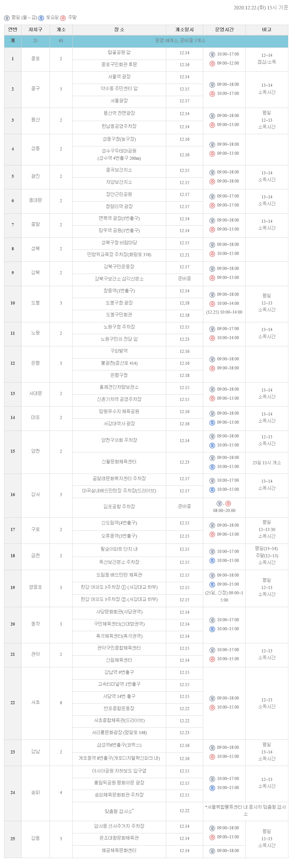 서울시 25개 자치구 임시선별검사소 현황