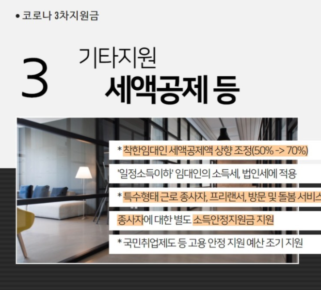 또한, 특수형태 근로종사자나 프리랜서, 방문 및 돌봄서비스 종사자에게도 별도 소득안정지원금을 지원한다고 밝혔습니다.