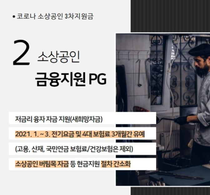 정부는 소상공인들에게 내년부터 금융지원도 함께 병행한다고 밝혔습니다. 2021년 1월부터 3월까지는 전기요금 및 4대 보험료를 3개월간 유예시켜 준다고합니다. 또한, 소상공인 버팀목 자금 등 현금지원 절차를 간소화 하여 피해를 입은 더 많은 사람들이 혜택을 볼 수 있도록 지원한다고 밝혔습니다.
