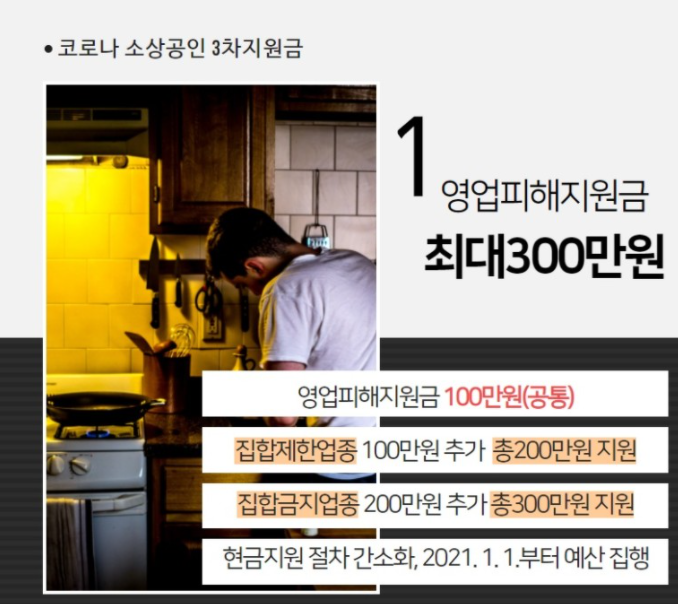 코로나 3차 대유행이 장기화 되면서 자영업자 및 소상공인의 경제적 피해가 막강합니다. 이에 정부에서는 소상공인에게 최대 300만원의 3차 재난지원금을 내년 1월 부터 지급할 예정이라고 합니다.