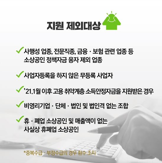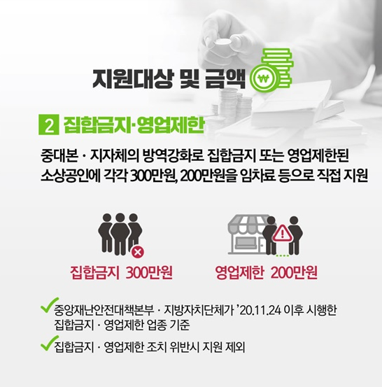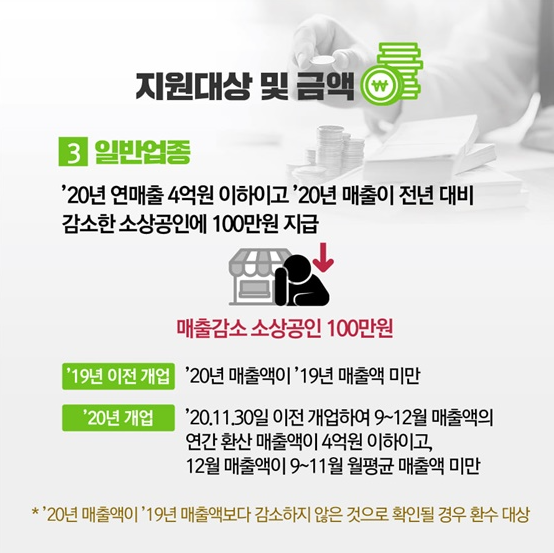 - 일반업종 소상공인 : 100만원 (20년 연매출 4억원 이하이고 20년 매출이 전년대비 감소한 소상공인)
