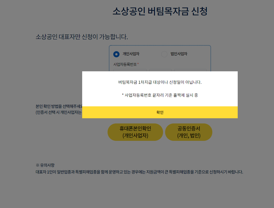 뒷자리가 짝수인 경우에는 아래와 같은 오류 메시지가 발생합니다. (버팀목자금 1차지급 대상이나 신청일이 아닙니다. * 사업자등록번호 끝자리 기준 홀짝제 실시중)