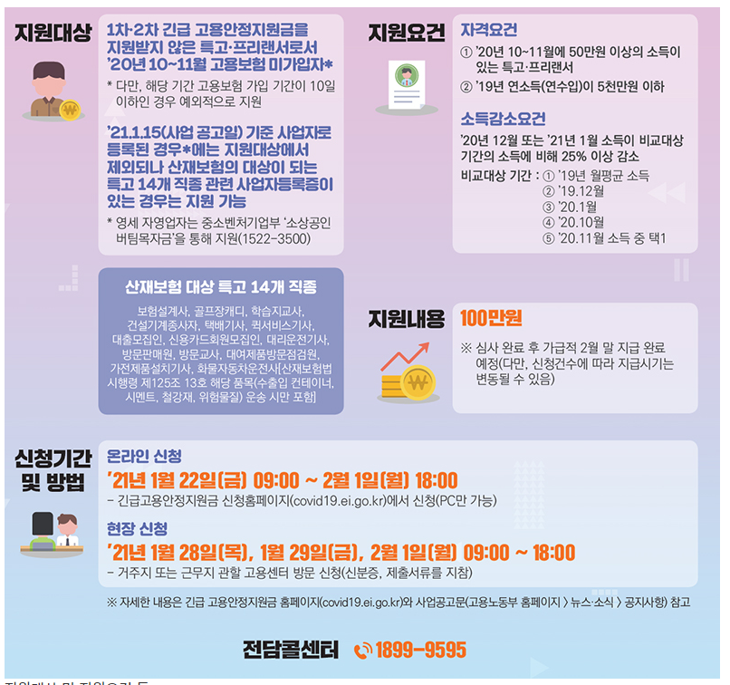 - 2021년 1월 15일 기준 사업자로 등록된 경우에는 지원대상에서 제외됩니다. 하지만 산재보험의 대상이 되는 특고 14개 직종관련 사업자등록증이 있는 자는 지원 가능합니다.