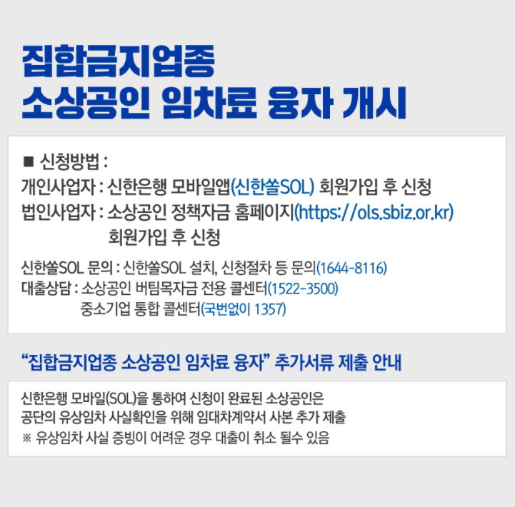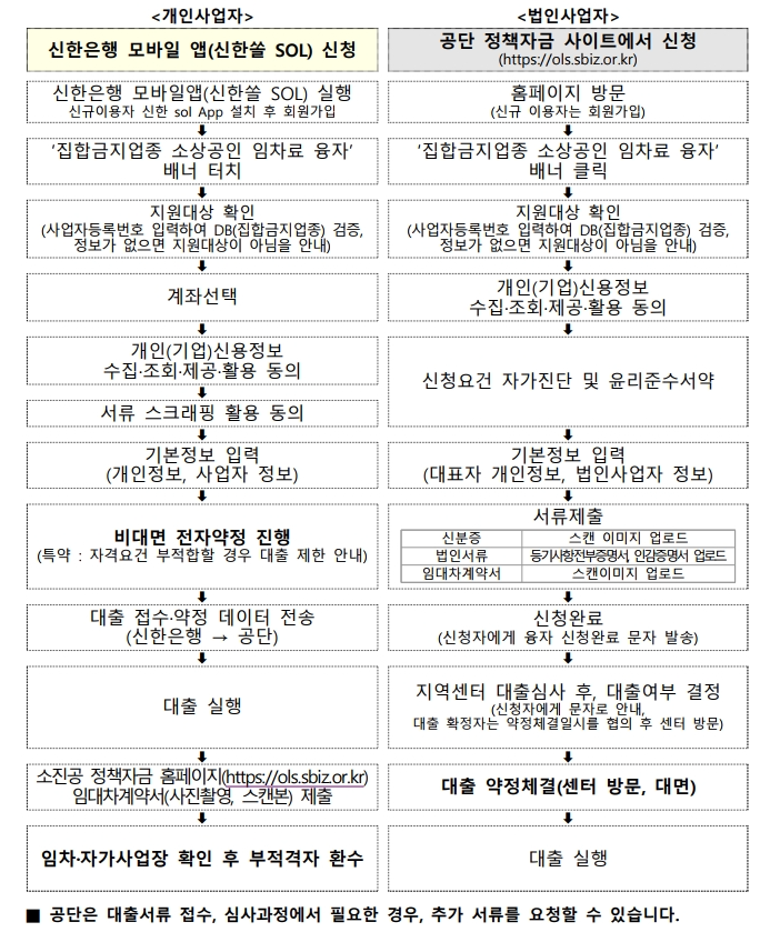 - 개인사업자는 신한은행 앱, 법인사업자는 소진공 홈페이지에서 신청
