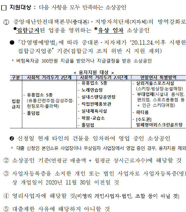 A1 지난해 11월 24일 이후 중앙재난안전대책본부 및 지자체에서 집합금지 명령을 내린 업체를 운영하고 있는 임차 소상공인을 대상으로 합니다.가 및 무상 임차 사업장은 제외하고 유상 임차 소상공인만 대상입니다.