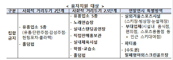 집합금지 업종은 유흥업소 5종(유흥주점·단란주점·감성주점·헌팅포차·콜라텍), 노래연습장, 실내스탠딩공연장, 직접판매 홍보관, 실내체육시설, 학원(교습소 포함), 홀덤펍, 실외겨울스포츠시설(스키장·빙상장·눈썰매장) 및 부대업체 등입니다.
