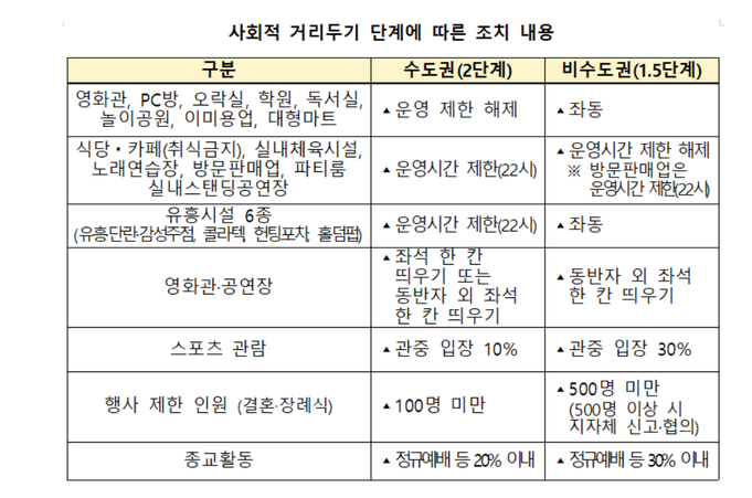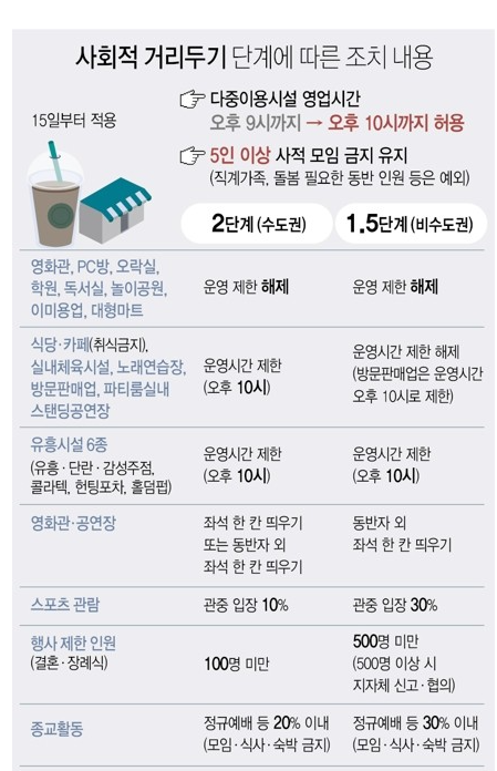 오는 15일부터 신종 코로나바이러스 감염증(코로나19) 방역 대응을 위한 '사회적 거리두기' 단계가 수도권 2단계, 비수도권 1.5단계로 한 단계씩 하향 조정됩니다.