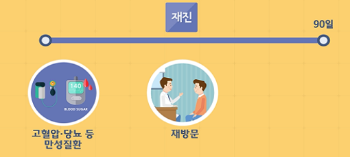 고혈압, 당뇨 등과 같은 만성질환 환자는 90일 이내로만 같은 병원, 같은 의사를 다시 찾으면 재진으로 구분된다.