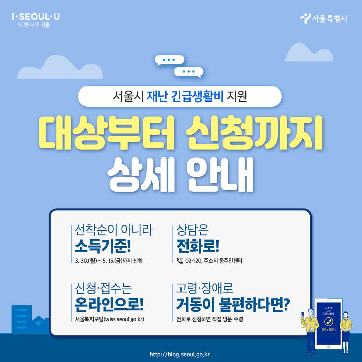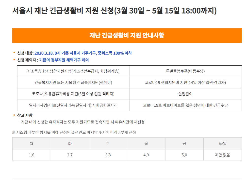 서울시 재난 긴급생활비 지원 신청(3월 30일 ~ 5월 15일 18:00까지) 재난 긴급생활비 지원 안내사항 신청 대상 :2020.3.18. 0시 기준 서울시 거주가구, 중위소득 100% 이하 신청 제외자 : 기존의 정부지원 혜택가구 제외 신청인의 출생연도 마지막 자리에 따라 요일별 접수 저소득층 한시생활지원사업(기초생활수급자, 차상위계층) 특별돌봄쿠폰(아동수당) 긴급복지지원 또는 서울형 긴급복지지원(생계비) 코로나19 생활지원비 지원(14일 이상 입원·