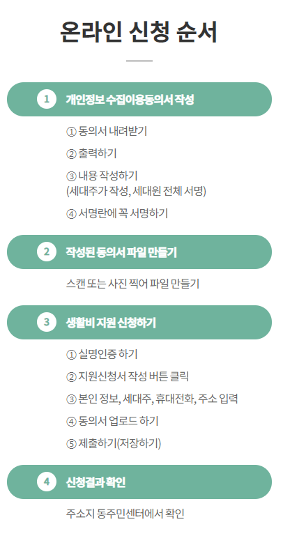 - 1~2인 가구 30만원, 3~4인 가구 40만원, 5인이상 가구 50만원