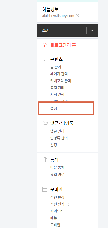 2.1 [티스토리URL]/manage에서 콘텐츠 - 설정에 들어갑니다.
