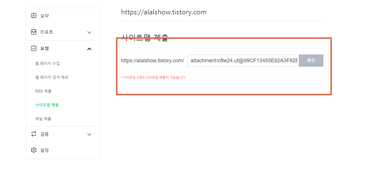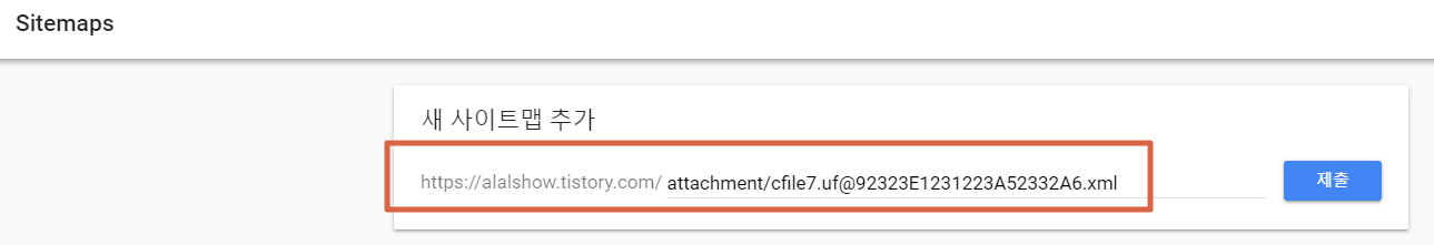 '사이트맵 제출' 버튼을 클릭하셨다면, 이제 빈칸에다가 아까 블로그에서 복사하신 링크를 붙여 넣기 해주시면 됩니다. 복사하신 링크에서 'https://~~~.tistory.com/' 부분은 지우시고 뒤에 attachment 부분부터만 남겨주시면 됩니다.