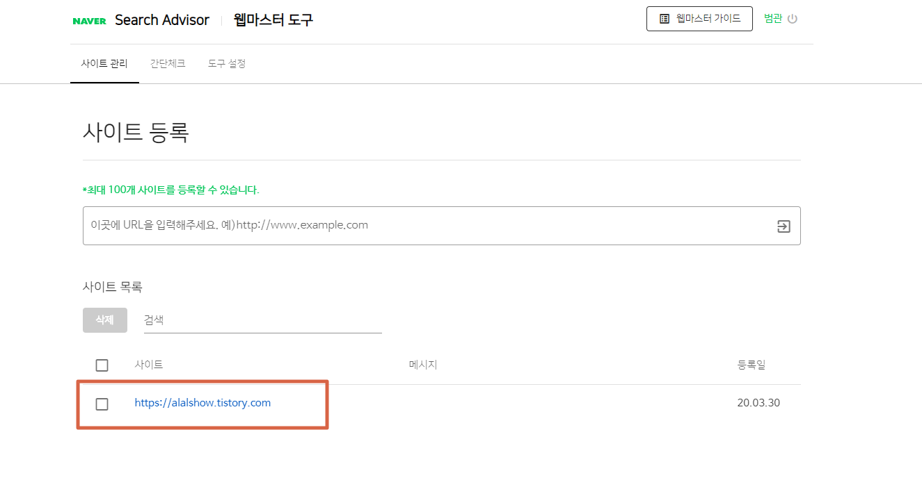 이제 사이트맵을 네이버에 제출하기 위해 https://searchadvisor.naver.com/console/wmt/board 네이버 웹마스터도구에 접속해 주신 후, 자신의 블로그를 클릭해주세요.