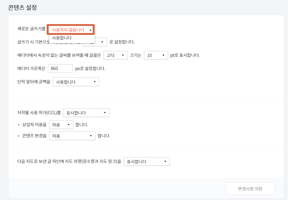2.2 새로운 글쓰기를 사용하지 않습니다로 변경후 [변경사항 저장]