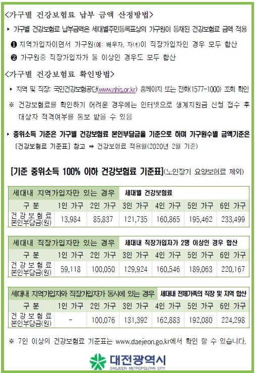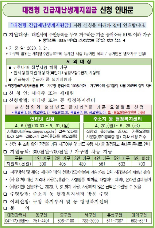대전시가 자체 긴급생계지원비와 정부의 긴급재난지원금 및 차상위계층 소비쿠폰을 더하면 코로나19 사태로 어려움을 겪는 중위소득 50% 이하 4인 가구에 최대 240만원을 지원하기로 하였습니다.