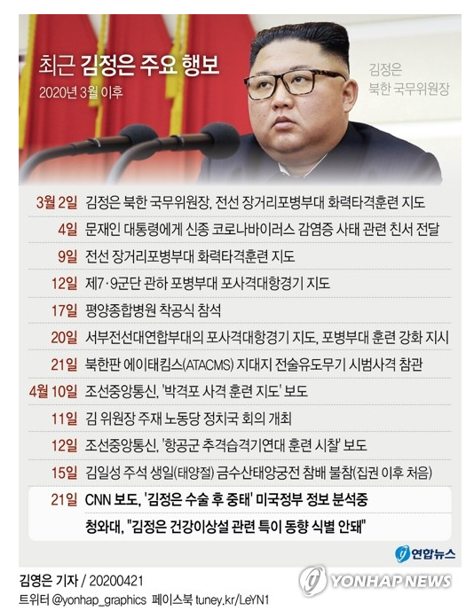 블룸버그 통신 -미 정부가 김 위원장이 지난주 심혈관계 수술을 받은 후 위독한 상태라는 정보를 입수하고 그의 건강에 관한 세부 내용을 파악 중이다. 도널드 트럼프 미 행정부는 김 위원장의 현재 상태를 확신하지 못하고 있다고 복수의 미 정부 관리들이 블룸버그에 밝혔다.