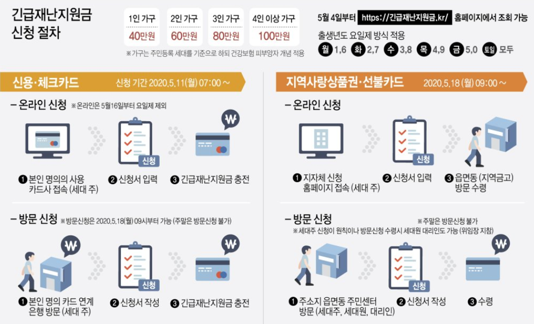 - 일반가구 - 2020.5.11(월)신청 시 2020.5.13(수) 지급, 2일 뒤 지급