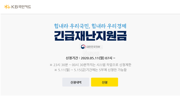 5월 11일부터 신청을 받는 재난지원금은 카드사에서 신청하는 신용카드, 체크카드 포인트 방식으로 '카드사 홈페이지'에서 온라인으로만 신청할 수 있으며, 신청 시 세대주의 공인인증서가 필요합니다.